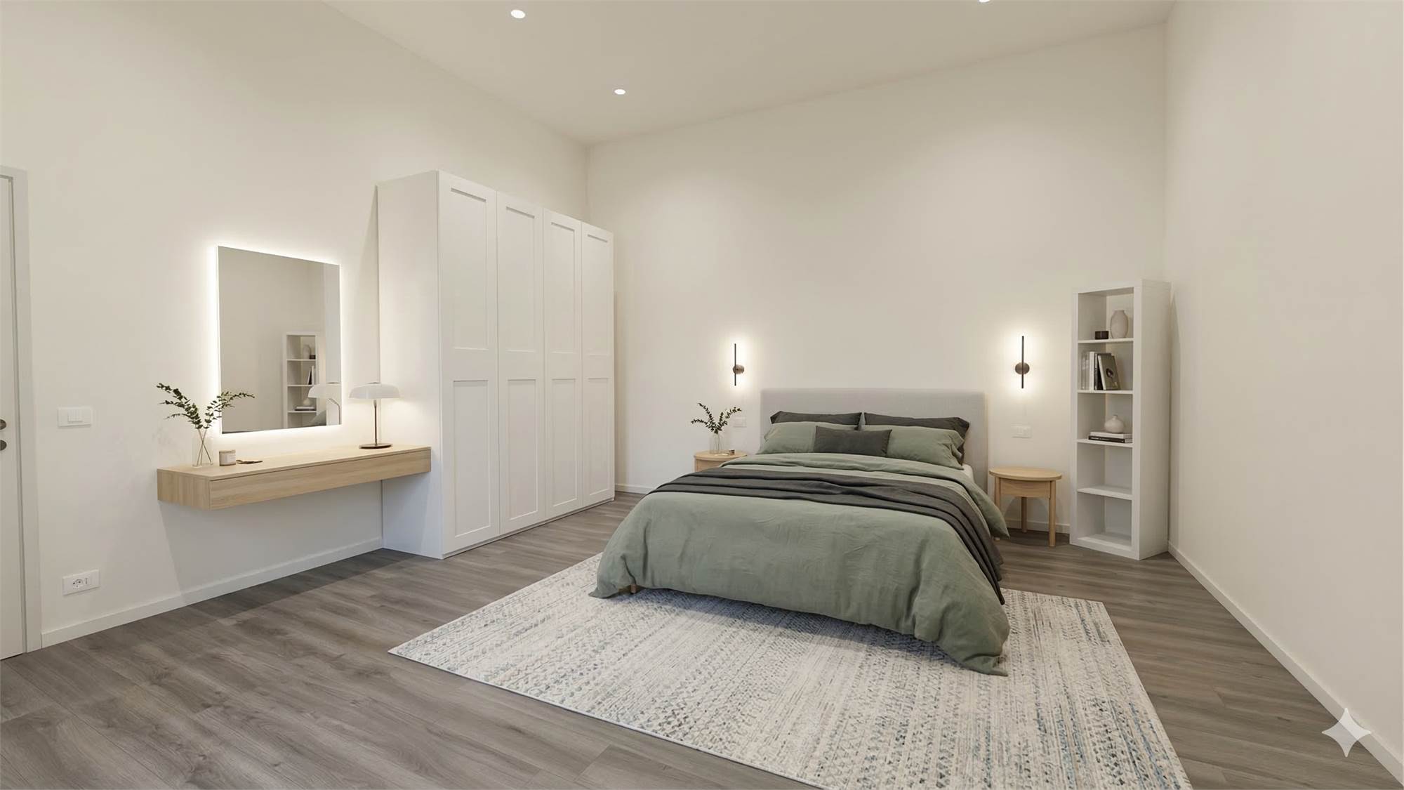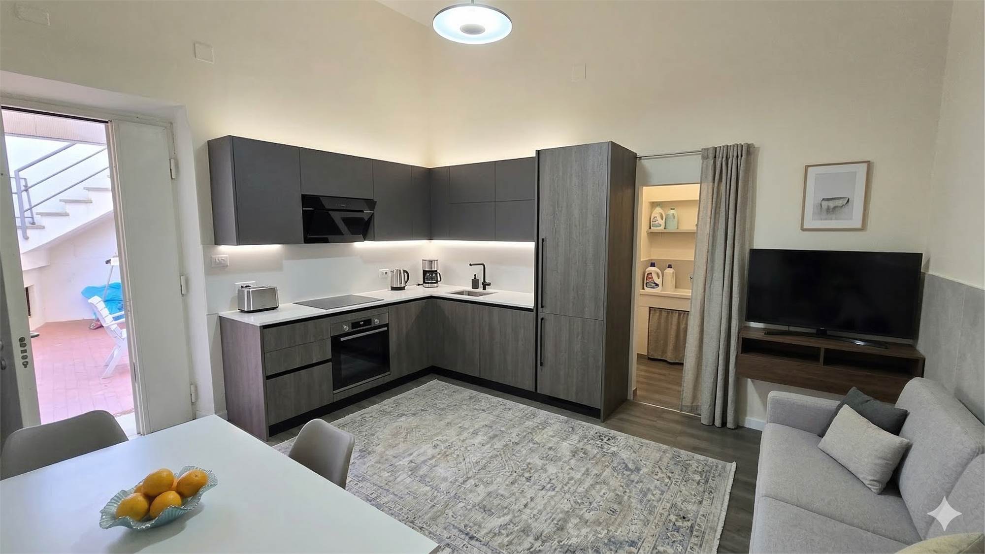 L'appartamento bilocale in vendita all'interno della residenza ha ingresso indipendente, accesso su soggiorno con cucina a vista, una zona lavanderia, un bagno con doccia e una ampia camera matrimoniale.