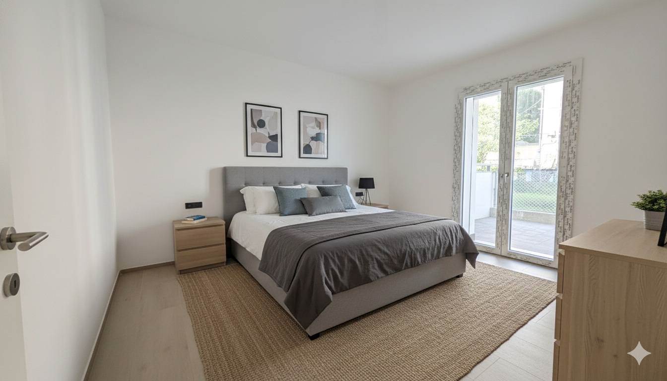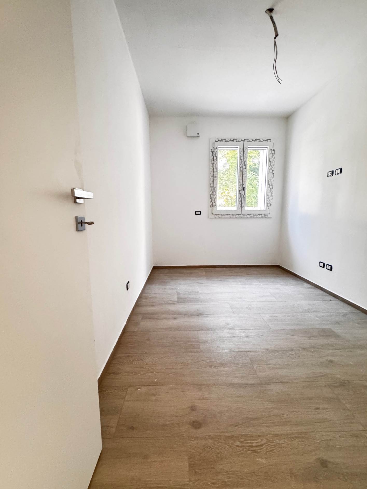 La zona notte comprende una camera da letto matrimoniale e una camera singola, oltre a un bagno finestrato con doccia e un pratico ripostiglio/lavanderia.